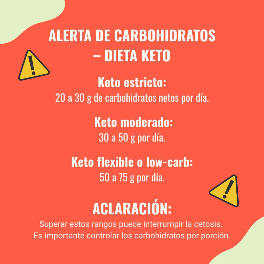 Carbohidratos muy bajos: Menos de 10 g para keto estricto y hasta 25 g en keto moderado, dependiendo de cuántas comidas hagas en el día.